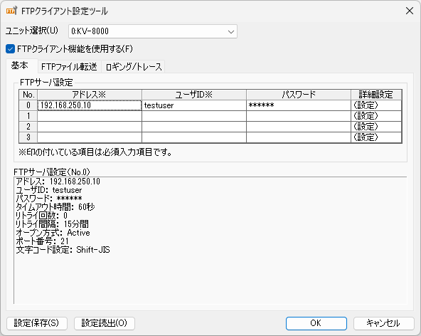 ユニットエディタの「FTPクライアント設定」でFTPサーバ設定に送信するFTPの設定をします