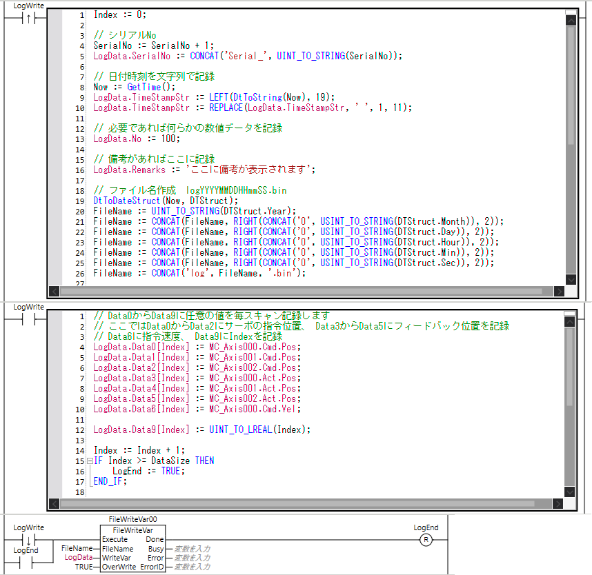 - LogEndフラグがONしたら、もしくはLogWriteフラグの立下りでFileWriteVar命令で構造体をまるごとSDに保存します