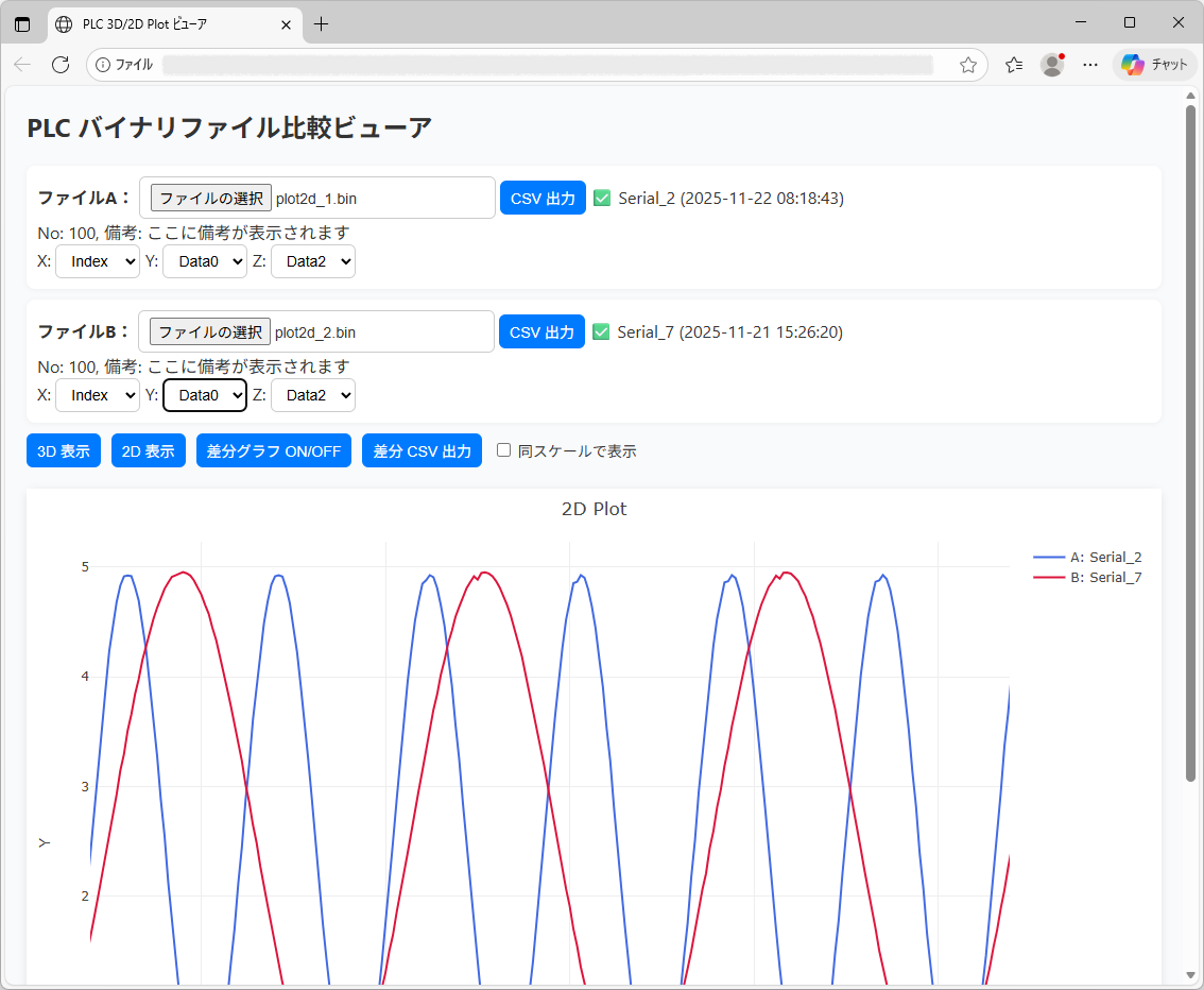 下図は"plot2d_1.bin"と"plot2d_2.bin"のファイルを開いてX軸をIndexに指定したグラフです