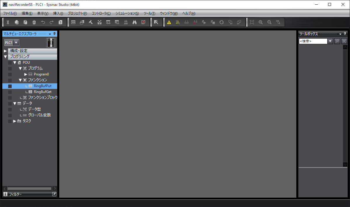 トレースするデータ ビットを16個、INT型、DINT型、LINT型、REAL型、LREAL型をそれぞれ1個づつ リングバッファの容量 65535個 トレースする周期 2ms -