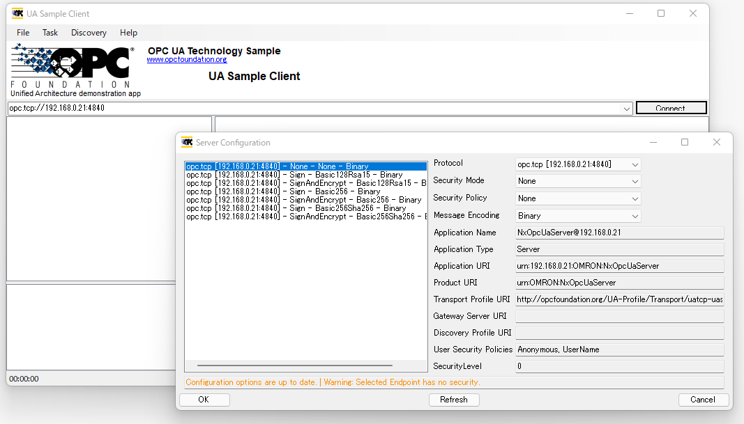 表示されたフォームのアドレス記入枠にURLを記入して[Connect]ボタンを押すとセキュリティポリシーを選択するダイアログが表示されます (例: opc.tcp://192.168.0.21:4840)
