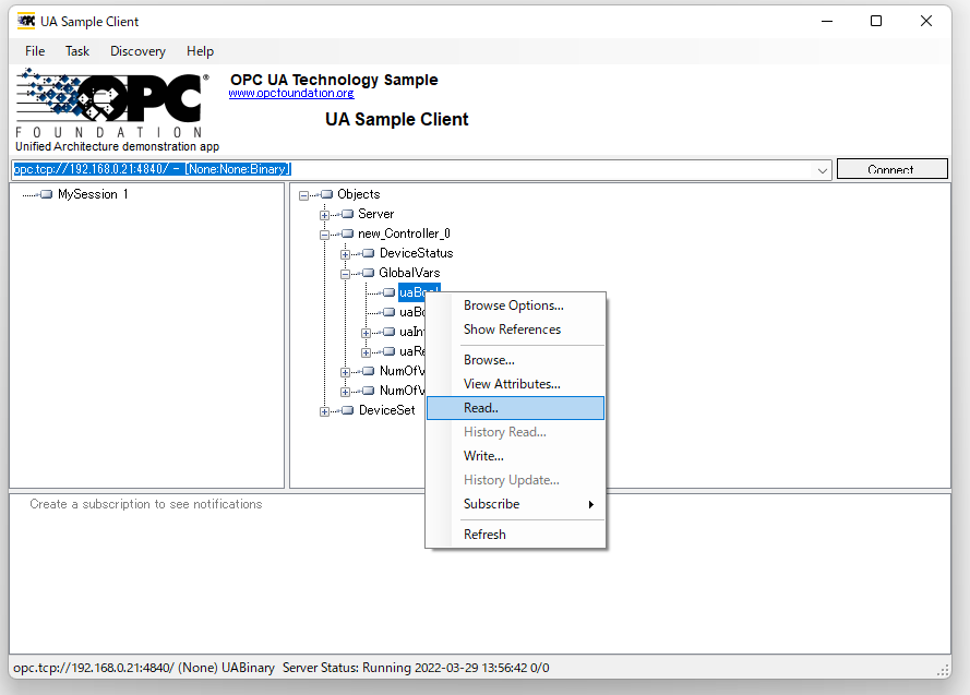- 接続が成功するとオブジェクトが表示されるのでPLC名称の下のGlovalVarsを開きます