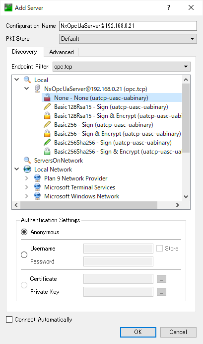 追加したサーバのセキュリティモードとポリシーの設定はNone-None(署名も暗号化もなし)を選んで、ユーザをAnonymous(匿名)を選択して設定を完了します