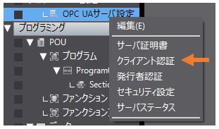 「OPC UAサーバ設定」を右クリックして「セキュリティ設定」を開きます