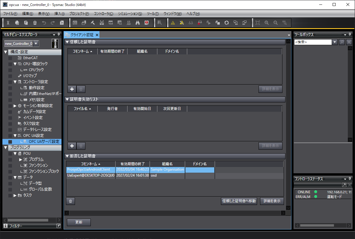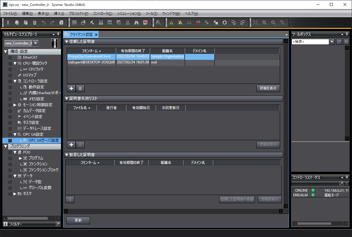 クライアント認証画面の下の拒否した証明書にUaExpertもしくはProsys OPC UA Clientが拒否された証明書として残っています