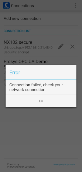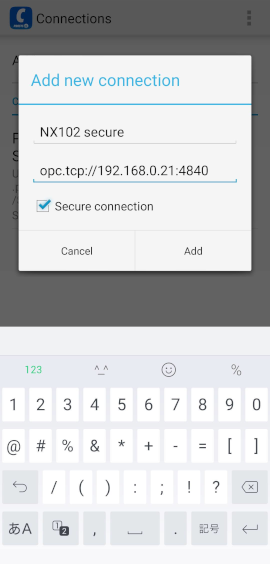 Secure connectionにチェックを入れてAddします 追加した接続設定をタップして接続を試します エラーが表示されます
