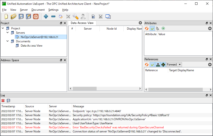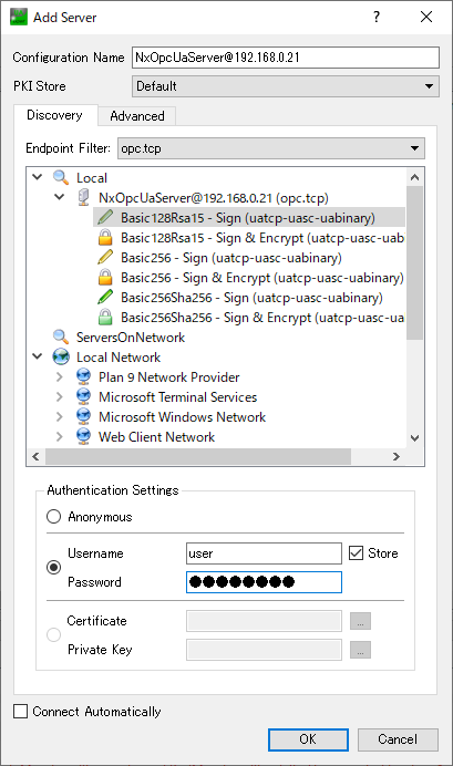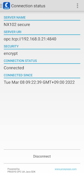 Prosys OPC UA Client のMobile版は匿名(Anonimouse)のみ対応のようなのでPLCの設定をAnonymouseにしてください