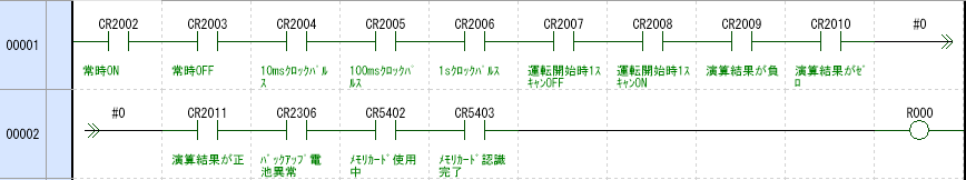 (数値は最大アドレスです)KV8000 CJ2H リレー R 32000 CIO 6144 内部補助リレー MR 64000 WR 8192 ラッチリレー LR 16000 HR 8192 リンクリレー B 32768 タイマ T 4000 T 4096 カウンタ C 4000 C 4096 コントロールリレー CR 1280 AR 48128 データメモリ DM 65535 DM 32768 拡張DM EM 65535 EM 32768 x 25 ファイルレジスタ FZ 524288 FM 32768 x 16 リンクレジスタ W 32768 テンポラリDM TM 512 インデックス Z 23 IR 16 DR 16 コントロールメモリ CM 9600