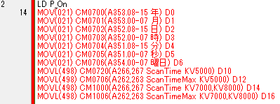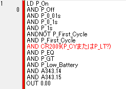 変換後のニモニックのうち赤文字の箇所がKVのCR2009がOMRONではP_CYとP_LTの2つの意味を持っているためどちらに変換するか判断できないため手修正が必要