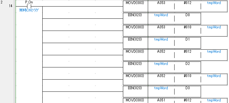 KVのラダー図(変換確認用で作成した回路なので実際にはこのような回路はありません)