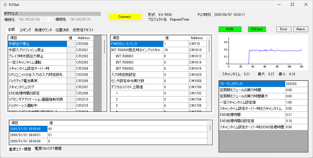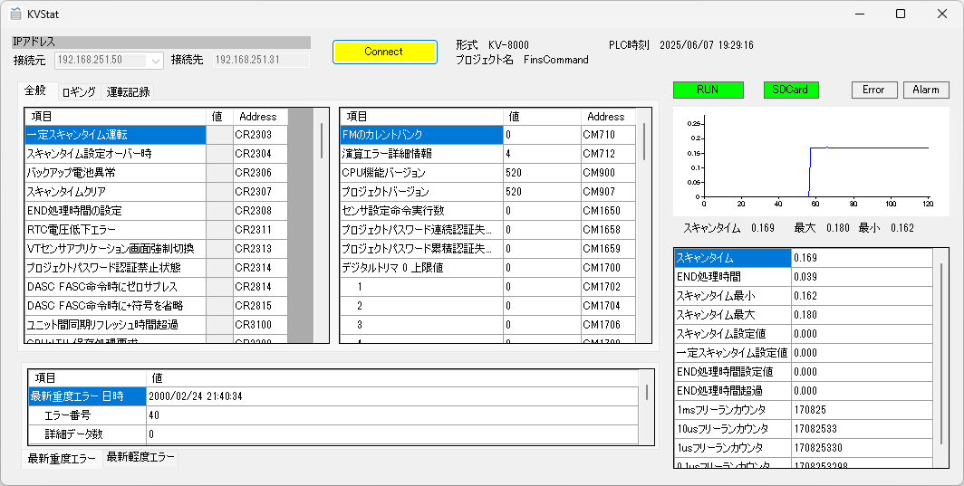 接続元(PC)のIPアドレスと接続先(PLC)のIPアドレスを設定して[Connect]ボタンを押すことでPLCの情報を読み出して定周期でスキャンタイムなどPLCの状態を読み出します